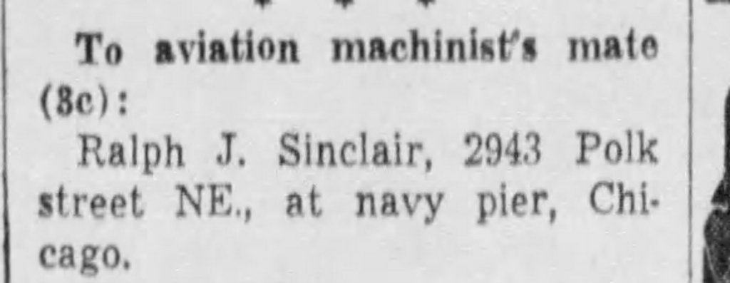 Ralph entered the service in 1942. In June of 1943 he was promoted to Aviation Machinist Mate 3rd Class at Navy Pier in Chicago, IL.