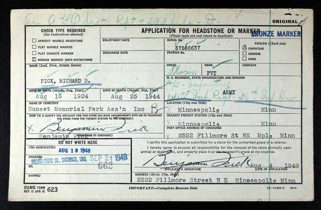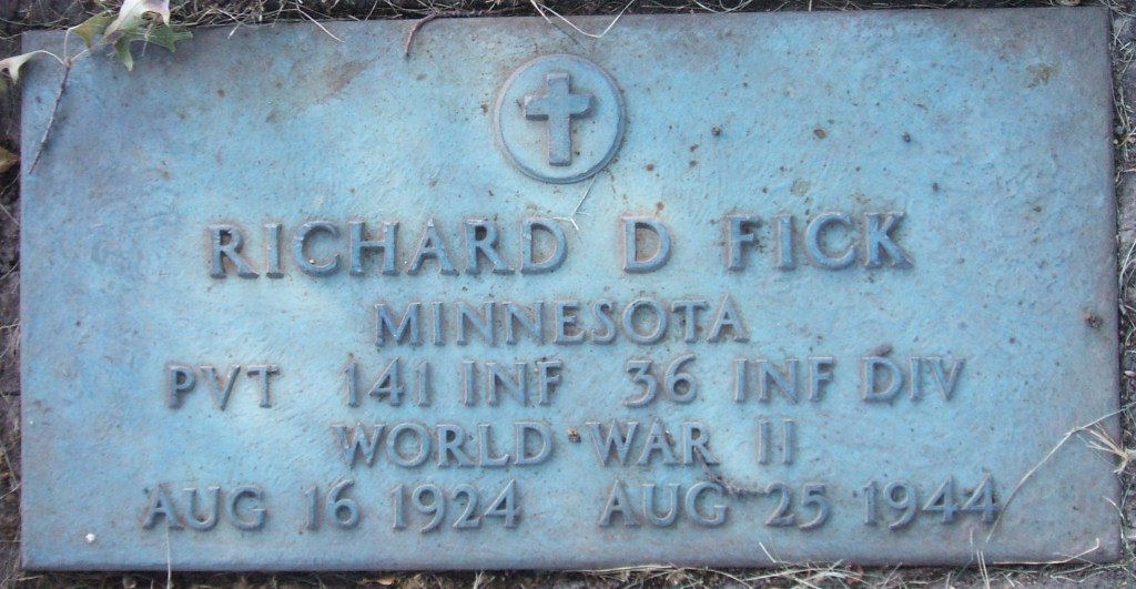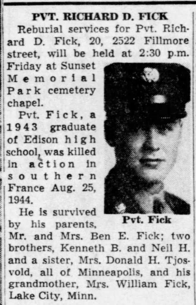 Originally buried in a temporary cemetery in France, Richard’s remains were returned to Minnesota for reburial in 1948.