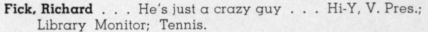 Richard graduated with the Class of June 1943. He was involved with Hi-Y. He was a Library Monitor, and he played on the Tennis team.