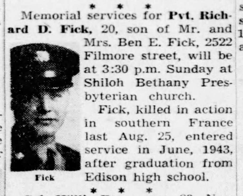 Richard was killed in action on 25 August in the fighting around Montélimar. The circumstances of his death are unknown. He was one of 1,575 Americans killed or wounded in the 8-day battle.