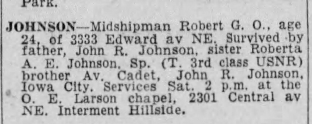 Robert was enrolled in the United States Naval Reserve Midshipmen’s School located at Northwestern University in Chicago, Illinois. Records indicate that he was 1 of 1,304 men who started with Class 16 on 1Sept1943.