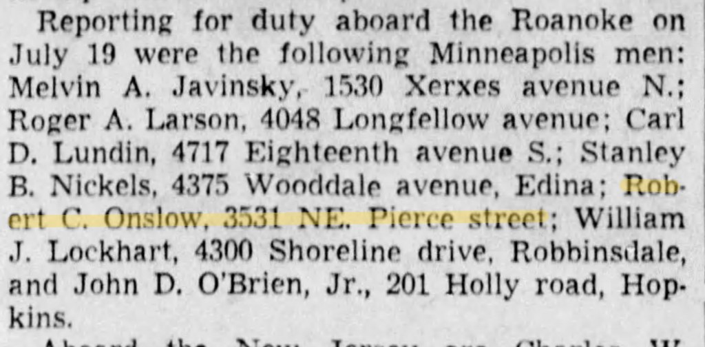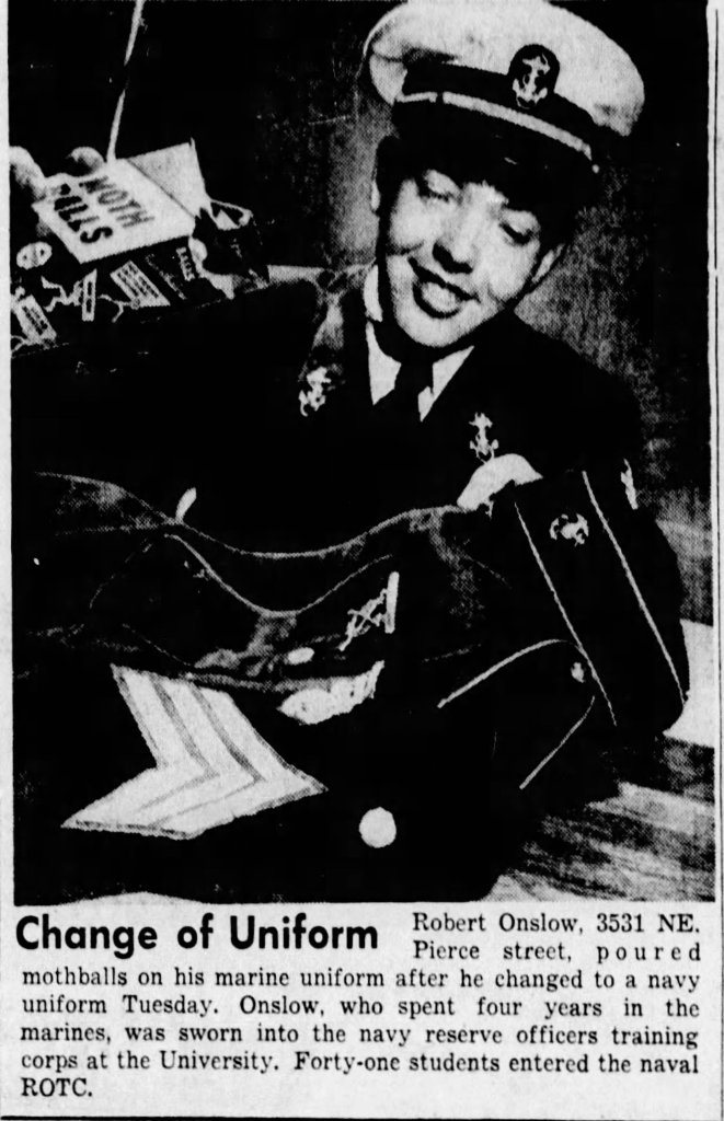 Robert enlisted in the Marine Corps Reserve after graduating from Edison. His reserve unit was called to active duty during the Korean War, but it does not appear that he ever deployed to Korea.