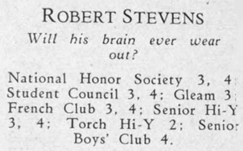 Robert graduated with the Class of January 1932. As indicated by his yearbook entry, he was very involved in school. A description of Hi-Y can be found in the FAQ tab. Gleam was a student run publication featuring stories, poems. and other writings.