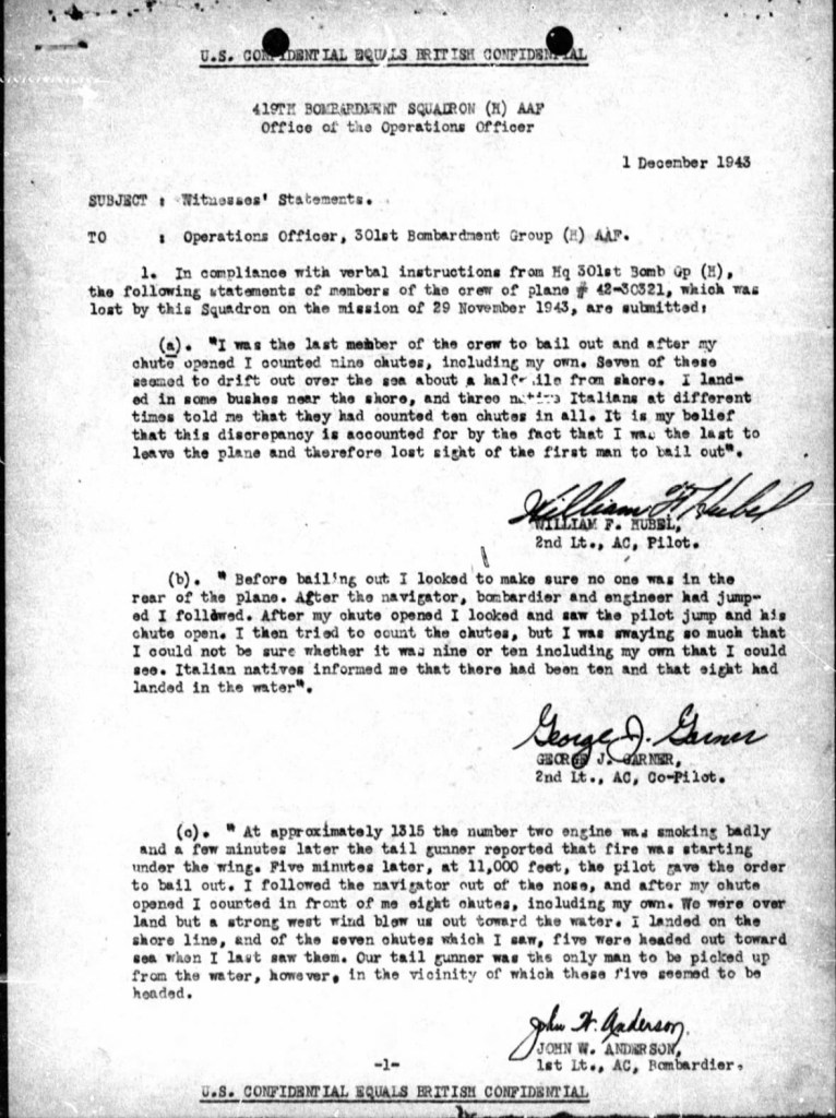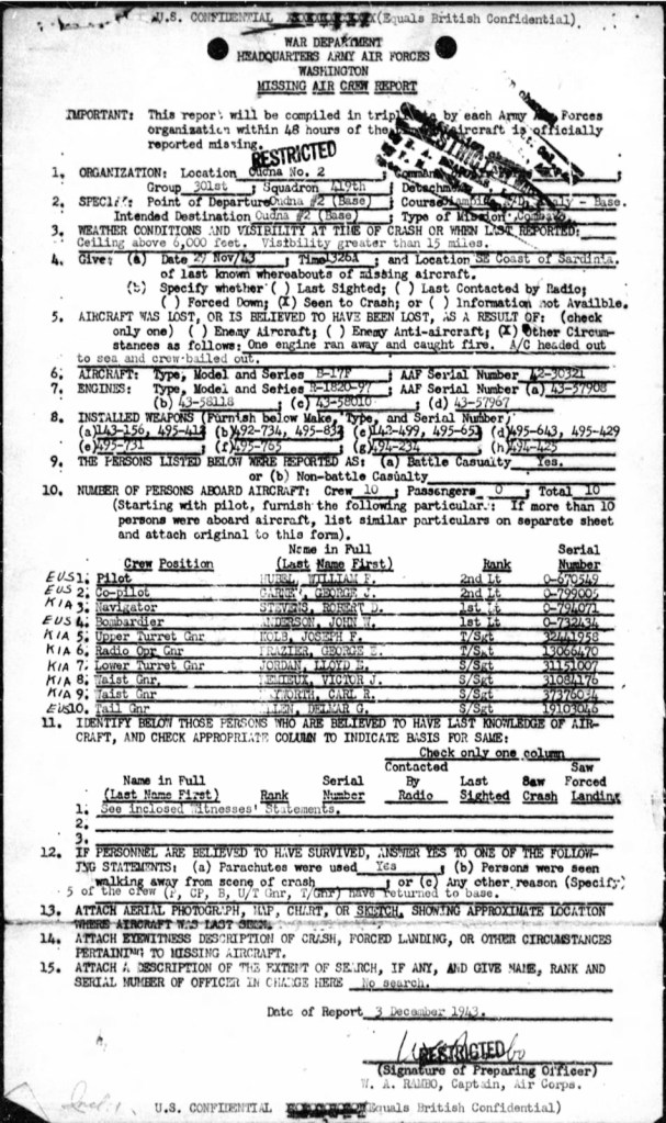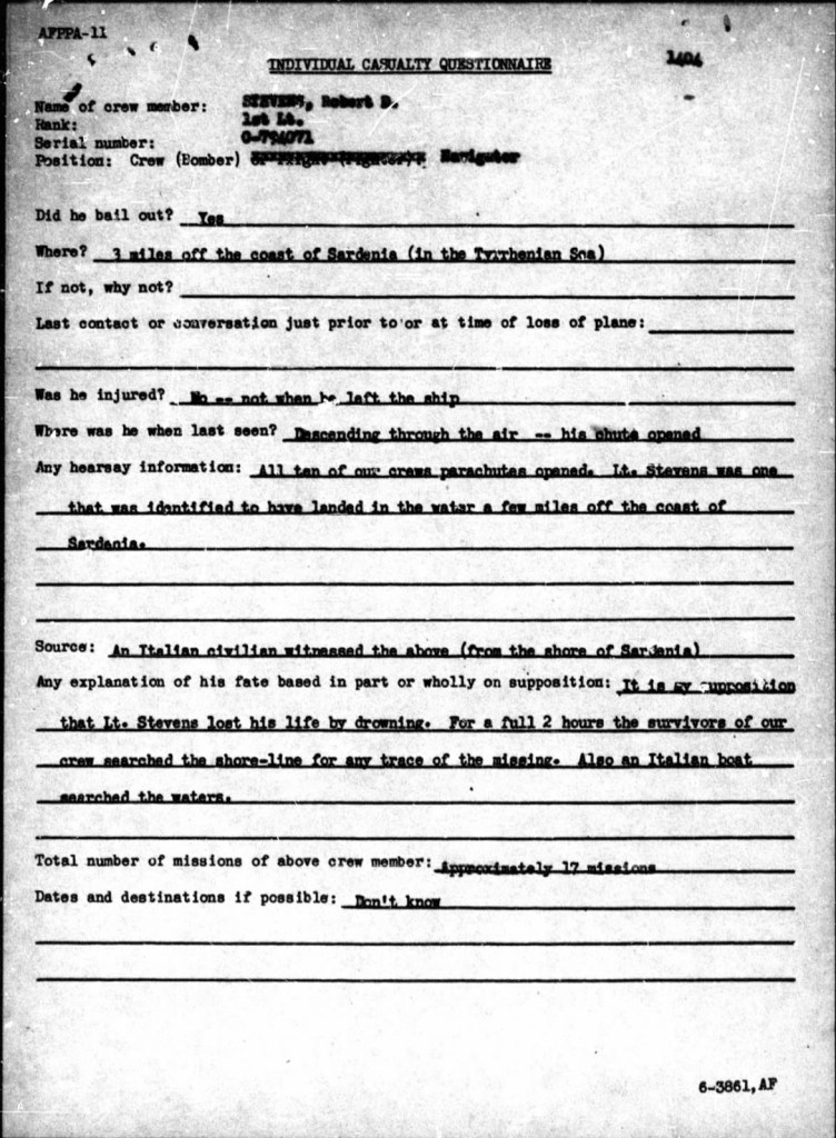 Robert’s final mission was a bombing run to the Ciampino Airfield 12 miles SE of Rome, Italy. At approximately 1315 while flying off the coast of Sardinia, Italy, they lost control of one of the engines. Shortly thereafter the Tail Gunner noticed that the wing of the plane was on fire. 5 minutes later, at an altitude of 11,000 feet, the Pilot gave the order for the crew to bail out.