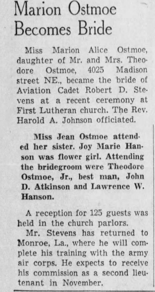 Robert enlisted in the National Guard on 10Feb1941 and later transferred to the Army Air Force. He took advanced training in Monroe, LA. In September 1942 he managed to return to MN to get married.