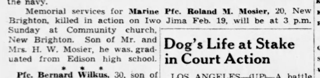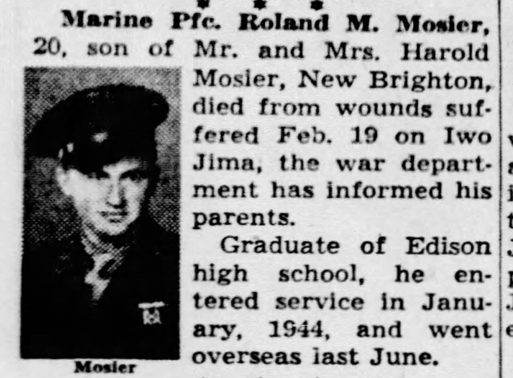 The 5th Marine Division was activated on 11Nov1943. They were a part of the initial invasion of Iwo Jima on 19Feb 1945. They suffered significant losses. The 5th Division would fight on Iwo Jima from 19 February until 26 March where they would sustain 2,482 killed in action, 19 missing in action, and 6,218 wounded in action. This was the highest casualty rate among the three Marine divisions involved in the invasion. The exact circumstances of Roland’s death are unknown at this time.