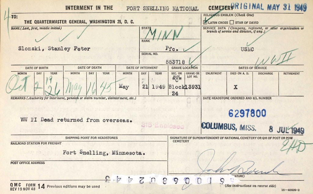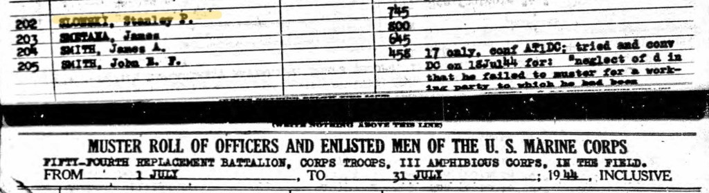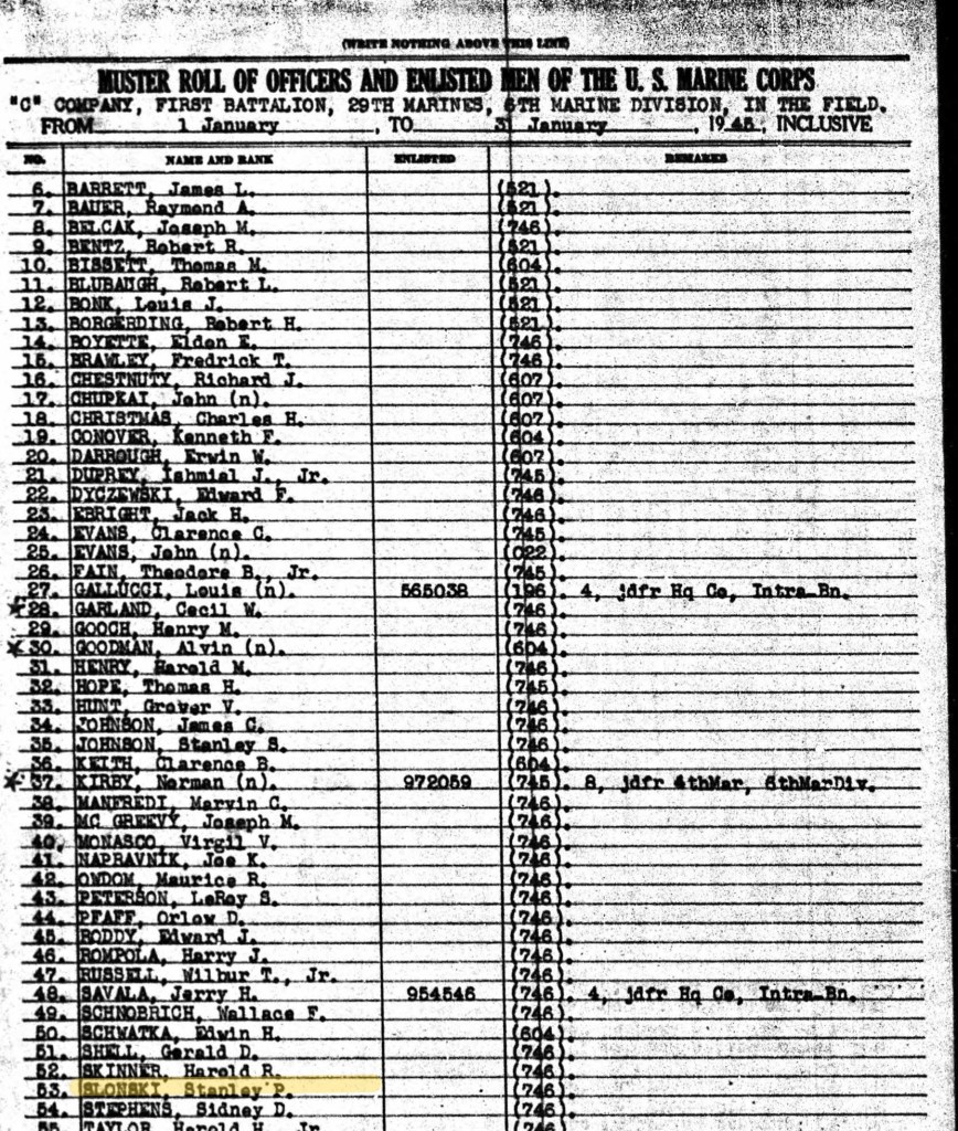 Stanley likely joined the 29th Infantry Regiment in September 1944 on Guadalcanal. The 6th Marine Division was newly formed and was training for “Operation Iceberg”, the invasion of Okinawa, Japan.