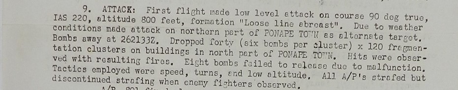 Taking off from Eniwetok, Steve’s plane was in 1 of 4 planes in the first group to take off. Their primary target was a new airstrip and military installations on the Ponape Island. 20 miles out from the target they were at 200′ above the water going 230 miles per hour. Poor weather over the primary target diverted them to the secondary target, Ponape Town.