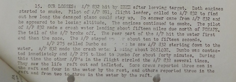 Later, another “Dumbo”, with fighter escort returned to search for the crew, but found nothing. The next day, three B-25s from the 48th Bombardment Group flew a search mission within two miles of the north and west of Ponape then south to Ant Island and north about 18 miles and 50 miles east of Pakin. The search had nil results.