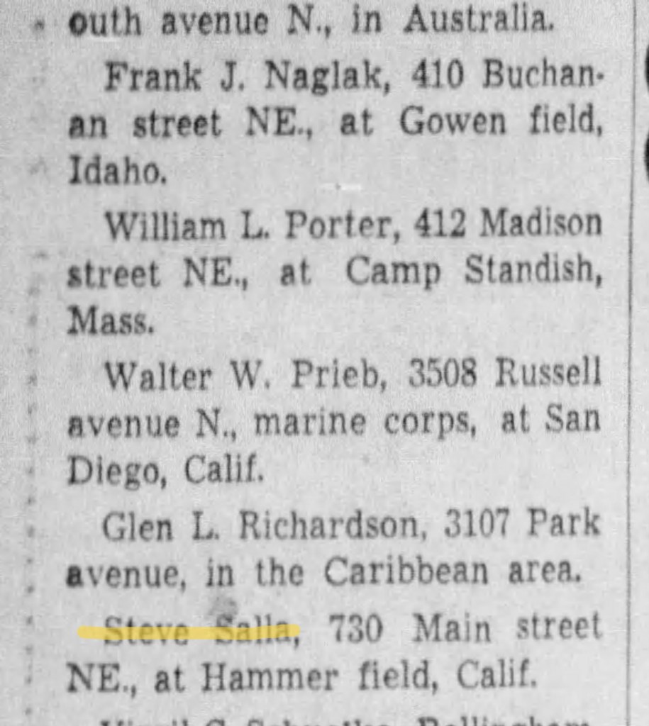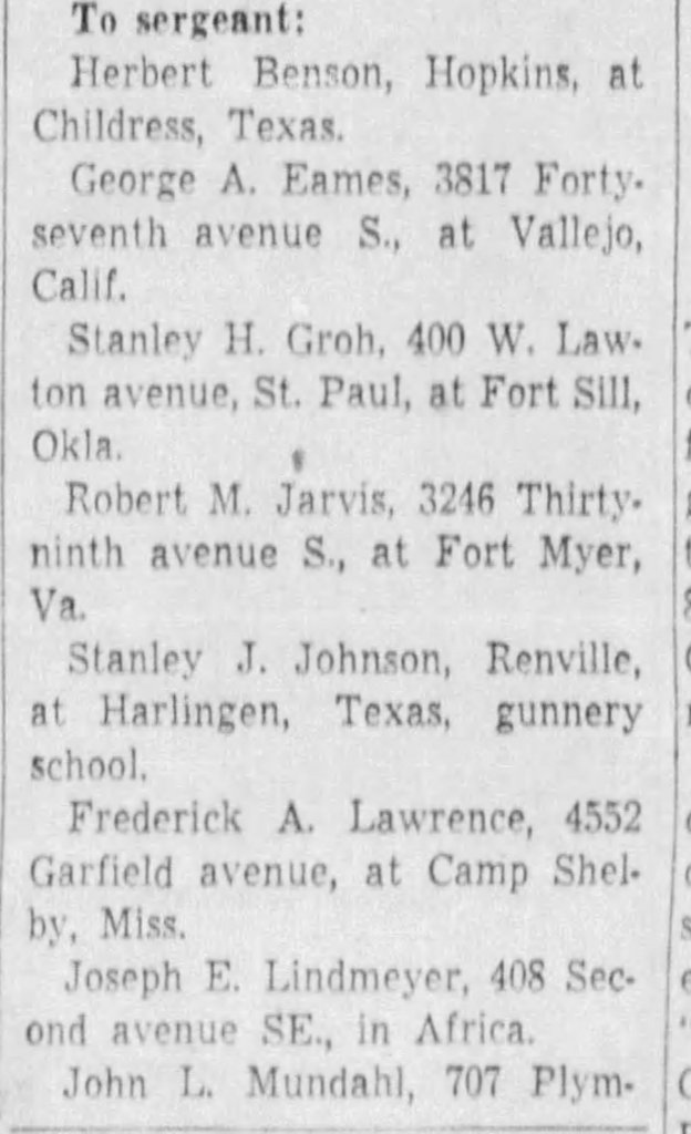 Steve was inducted into the Army on 9Oct1942 at Fort Snelling. He reported for active duty on 22Oct1942. He received training in St. Petersburg, FL, at Lowry Field, CO, Tyndall Field, FL, and at Hammer Field in Fresno, CA. In April 1943 he was promoted to Sergeant.