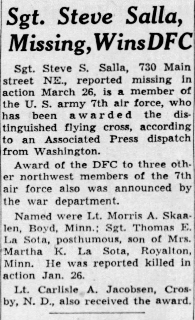 The fate of the crew is unknown. There was no record of their capture by the Japanese. Originally declared missing in action, Steve and the crew were officially declared dead on 19Jan1946.