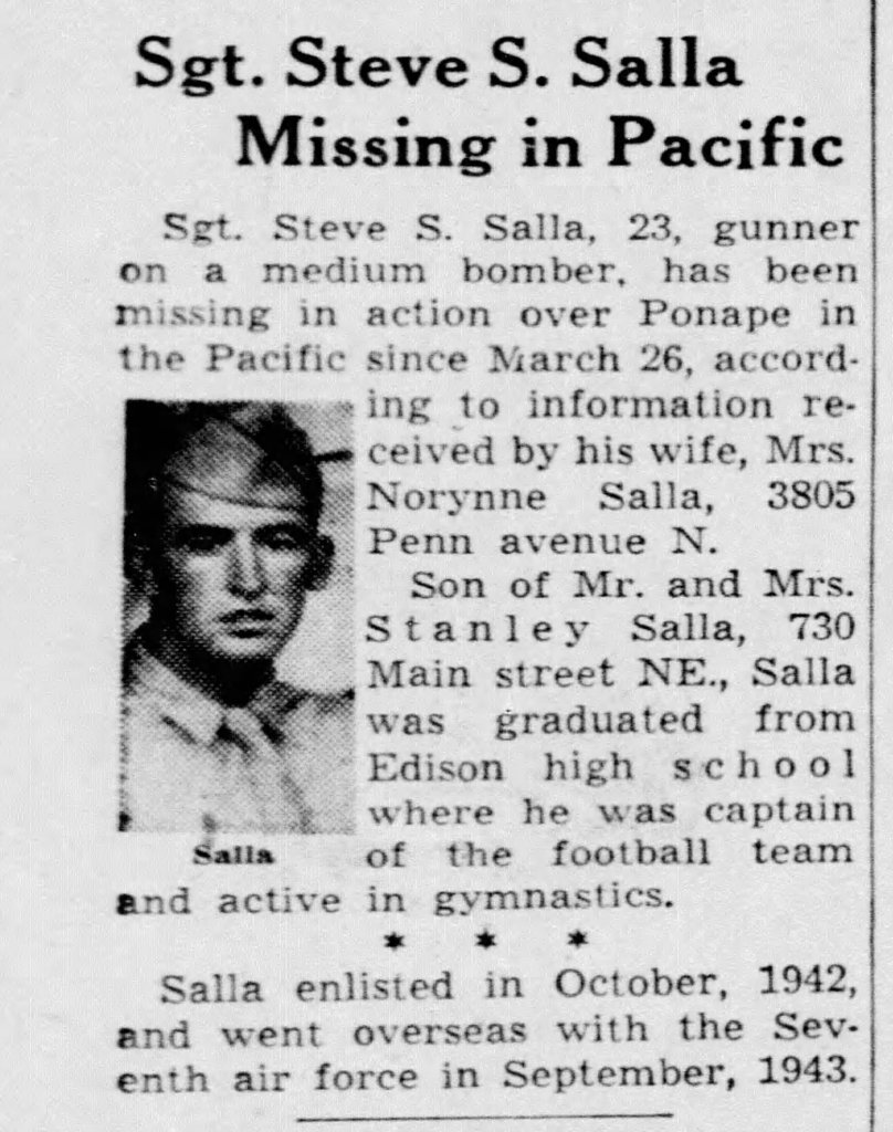 Steve’s plane made a forced landing into the ocean approximately 15 miles North of Ponape Island. The other planes in the flight observed Steve’s plane go down and they witnessed a life raft in the water with 3 or 4 men aboard and 3 of 4 men in the water hanging onto the raft. They also called for a “Dumbo” amphibious rescue plane to try and pick the crew up.