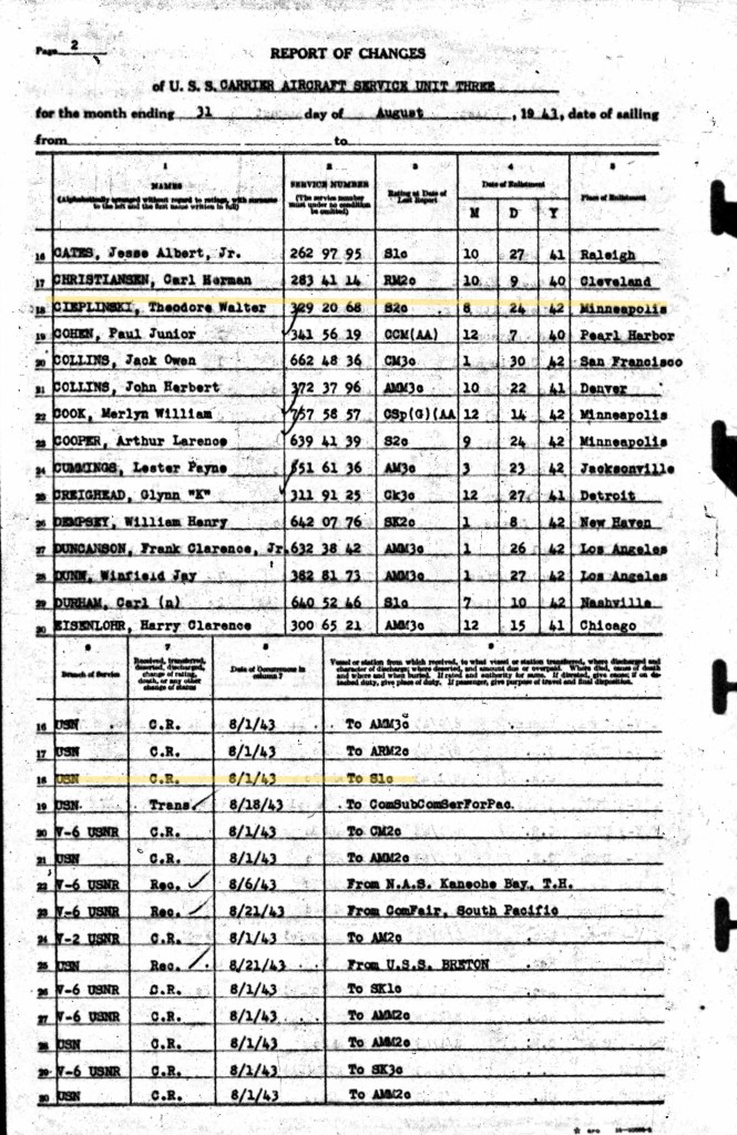 Edward enlisted in the Navy on 24Aug1942. It is unknown where he took his basic training. After basic training it is likely that he was assigned to Carrier Aircraft Service Unit No. 3 (CASU-3).