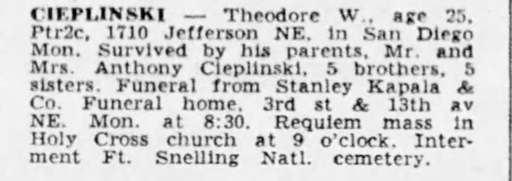Ted died on 17Dec1945 in San Diego, California. While he was on active duty at the time of his death, the circumstances are unknown at this time.