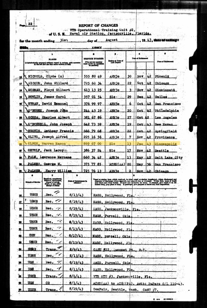 Warren enlisted in the Navy on 13Jan1943. After basic training, he went to advanced training at Naval Air Station Jacksonville, FL.