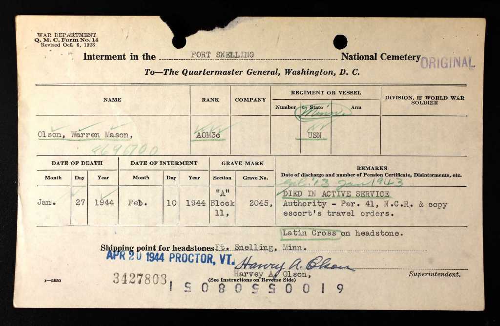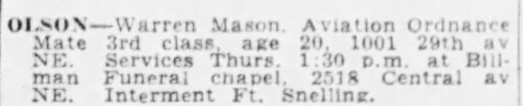 Warren’s remains were returned to Minnesota, and he is buried at Fort Snelling National Cemetery in Minneapolis, MN.