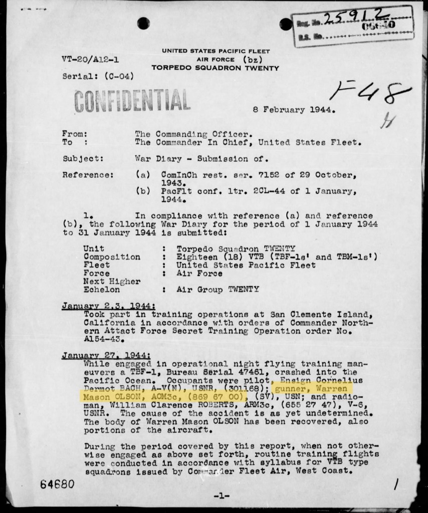 On 27Jan1944, Warren, the gunner on a TBF-1 torpedo bomber, was engaged in an operational night flying training mission of the coast of San Diego, CA. The plane crashed into the Pacific Ocean.
