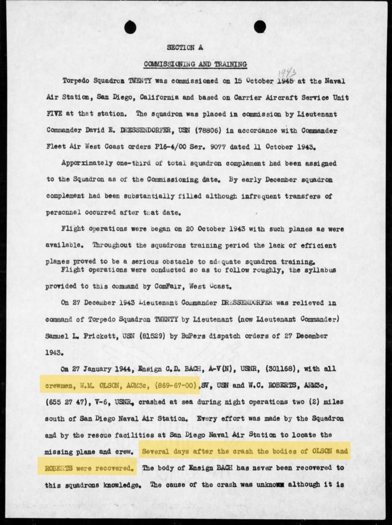After advanced training William was assigned to Torpedo Squadron 20 which was stood up 11Oct1943. Based out of Naval Air Station San Diego, the squadron commenced with training prior to going overseas.