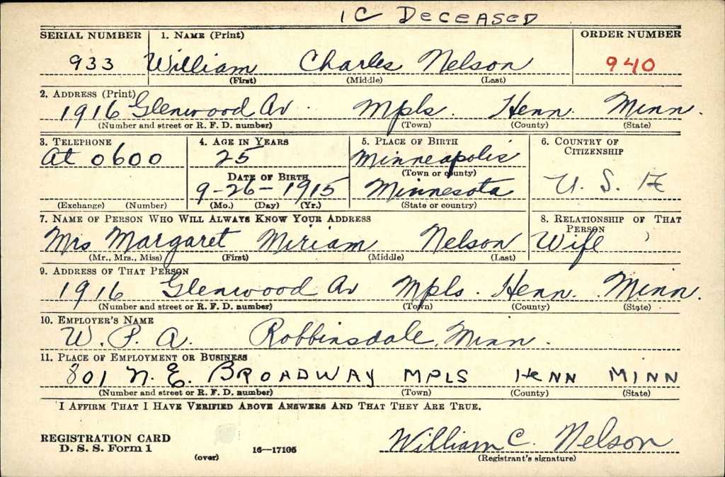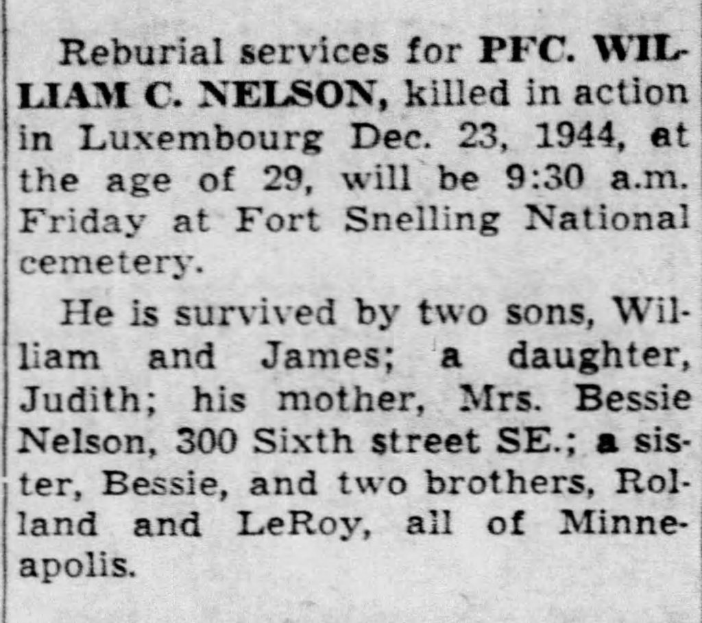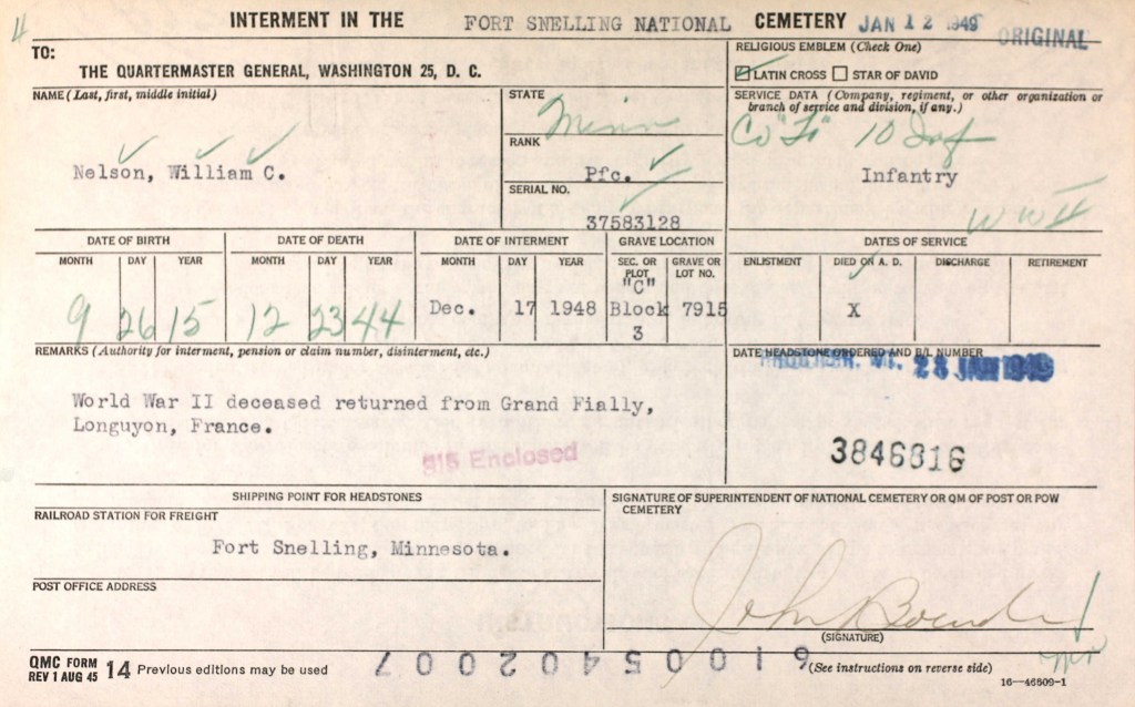 William was originally buried in a temporary cemetery in France. In 1948 his remains were returned to the Unted States for reburial at Fort Snelling National Cemetery in Minneapolis, Minnesota.