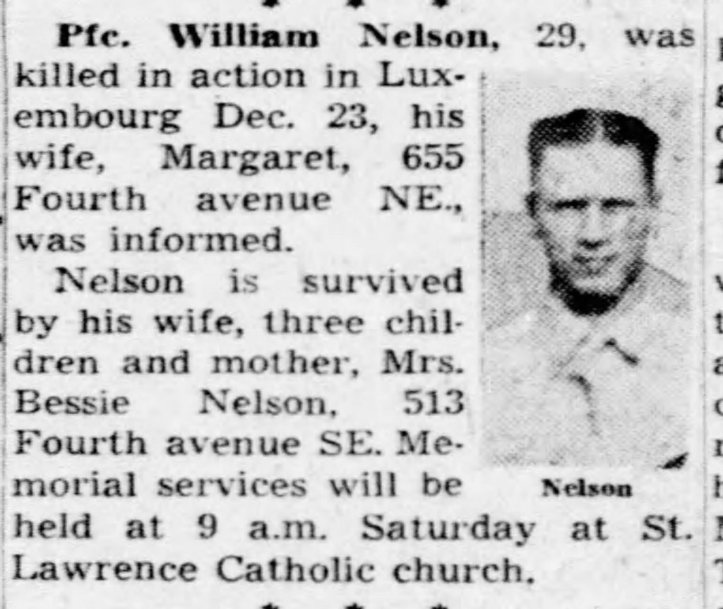 The 10th Regiment took positions south and southwest of Echternach, Luxembourg facing elements of the German 212th Volksgrenadier Division. It was on 23Dec1944 that William was killed by German artillery fire.