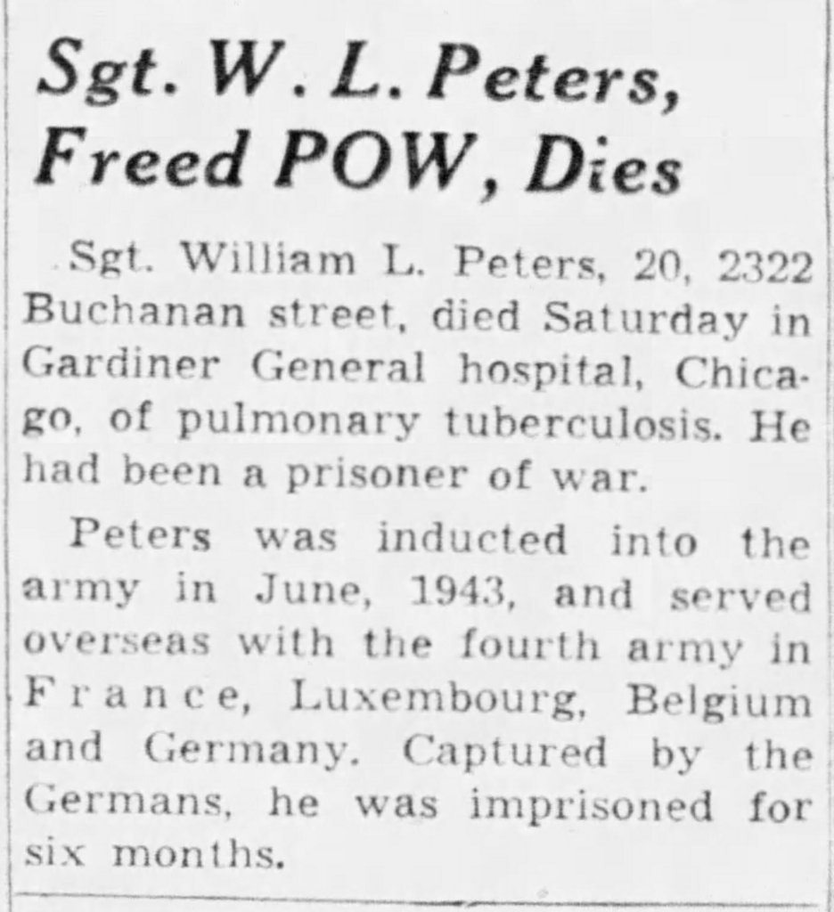 In June 1945 William arrived at Gardiner Hospital in Chicago, Illinois for treatment of his injuries. On 10November1945 he died of pulmonary tuberculosis. He likely contracted the disease while a prisoner of war.