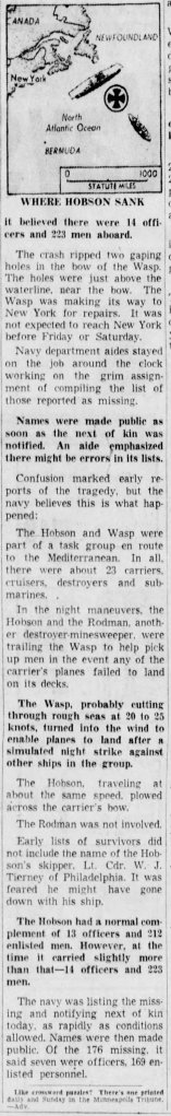 The task force conducted a mock nighttime attack on other ships in the task force with carrier-based aircraft. When the exercise was over, the carrier USS Wasp changed course into the wind to facilitate the recovery of her aircraft. The Hobson misjudged the course of the Wasp and at 10:26pm the Wasp struck the much smaller Hobson amidship. The force of the collision rolled the Hobson over and it broke into 2 pieces. The Hobson sank in 4 minutes.