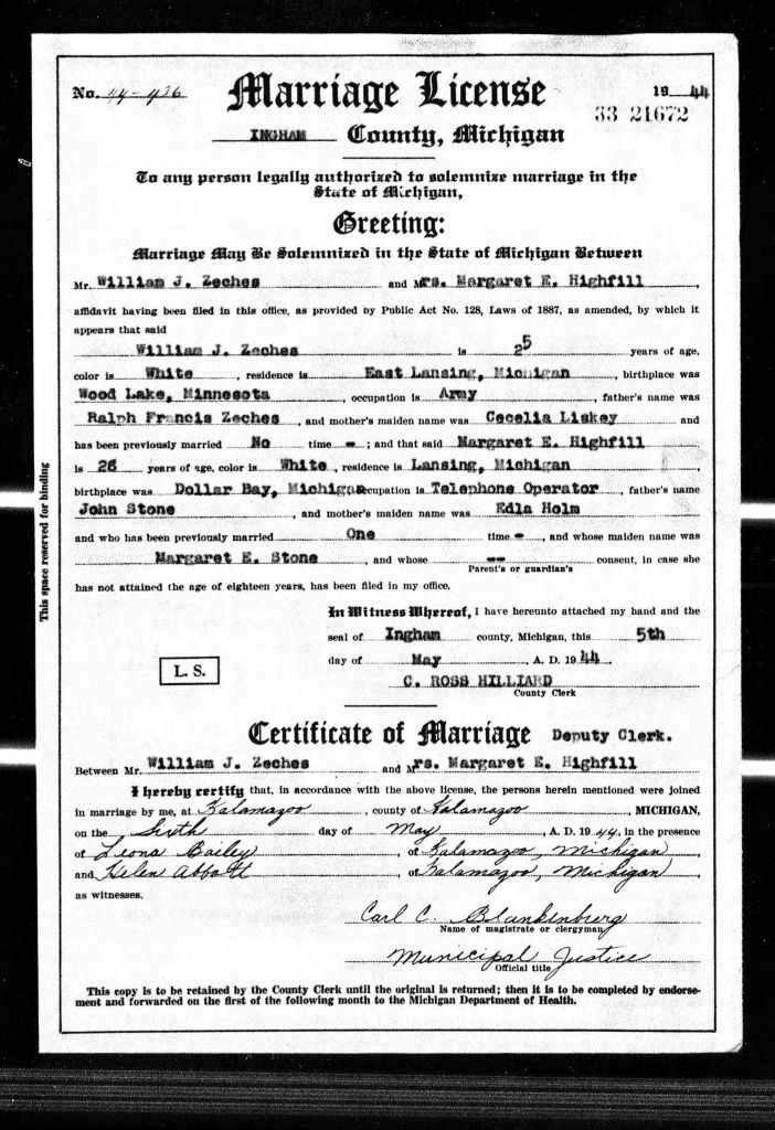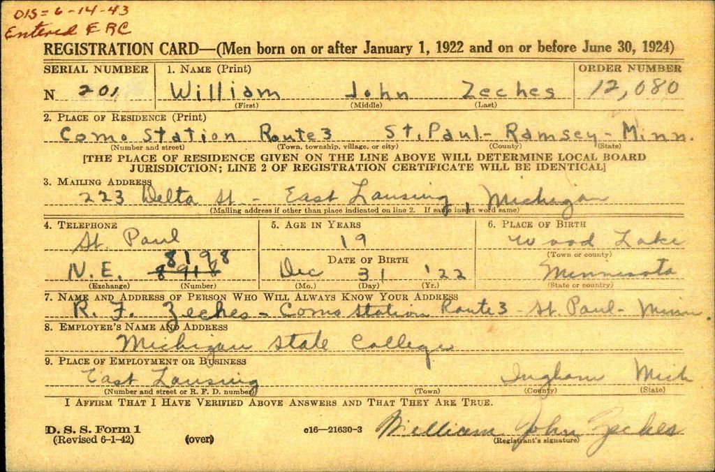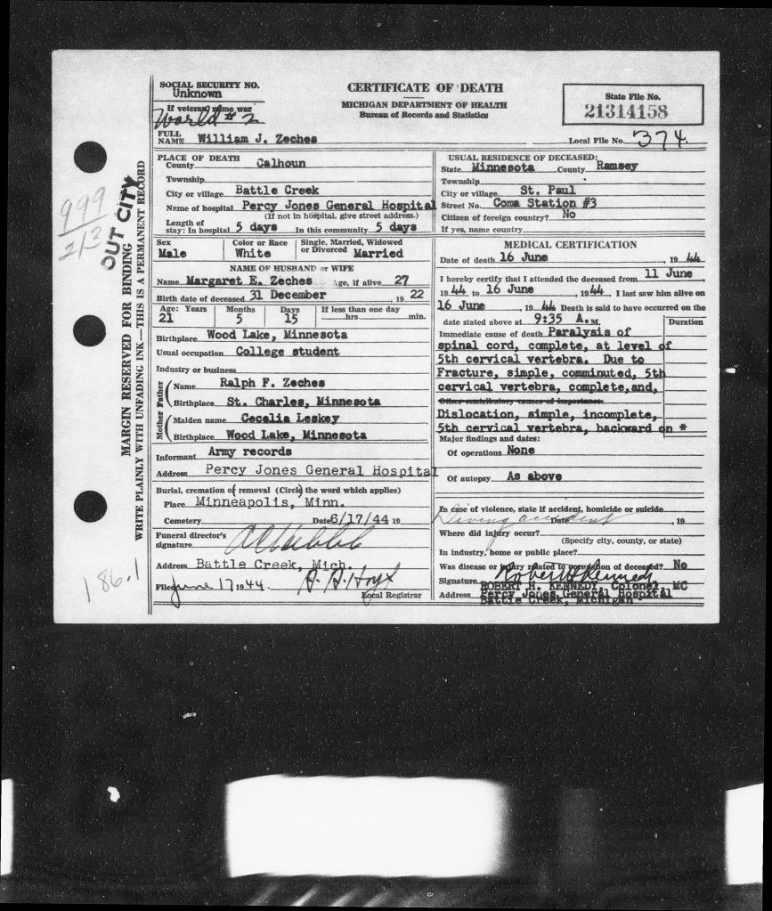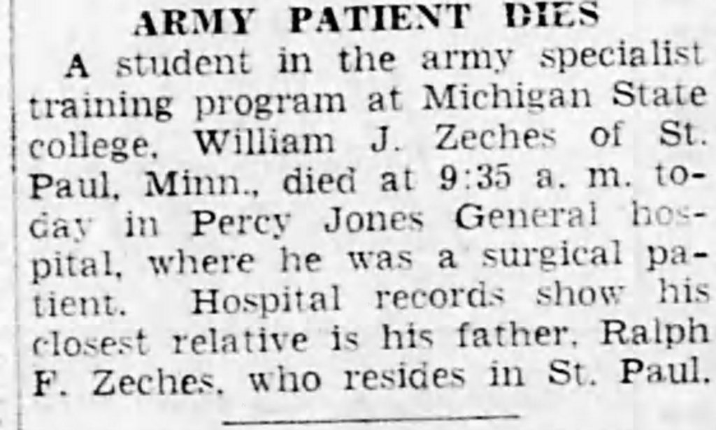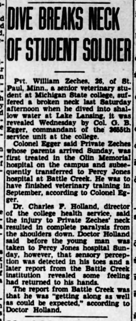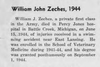 William attended veterinary school at Michigan State College. In the morning of 10Jun1944, William graduated from college. Later that afternoon, William broke his neck in a swimming accident.